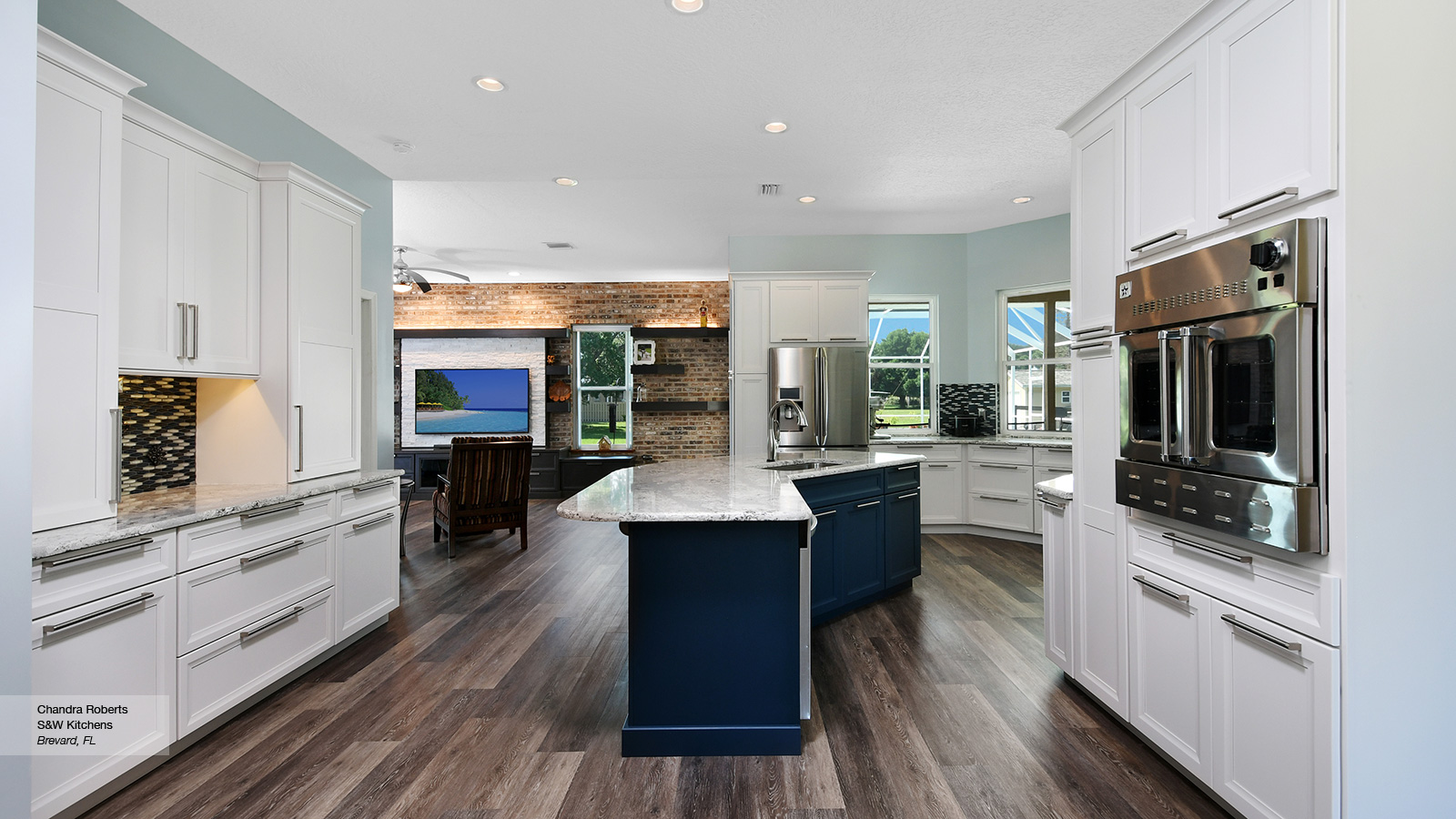 Make a bold statement and create a striking contrast with blue island cabinets in an off white kitchen. Smooth, clean lines of the Cayhill cabinet door allude to a style that is casually refined and thoughtfully on-trend.