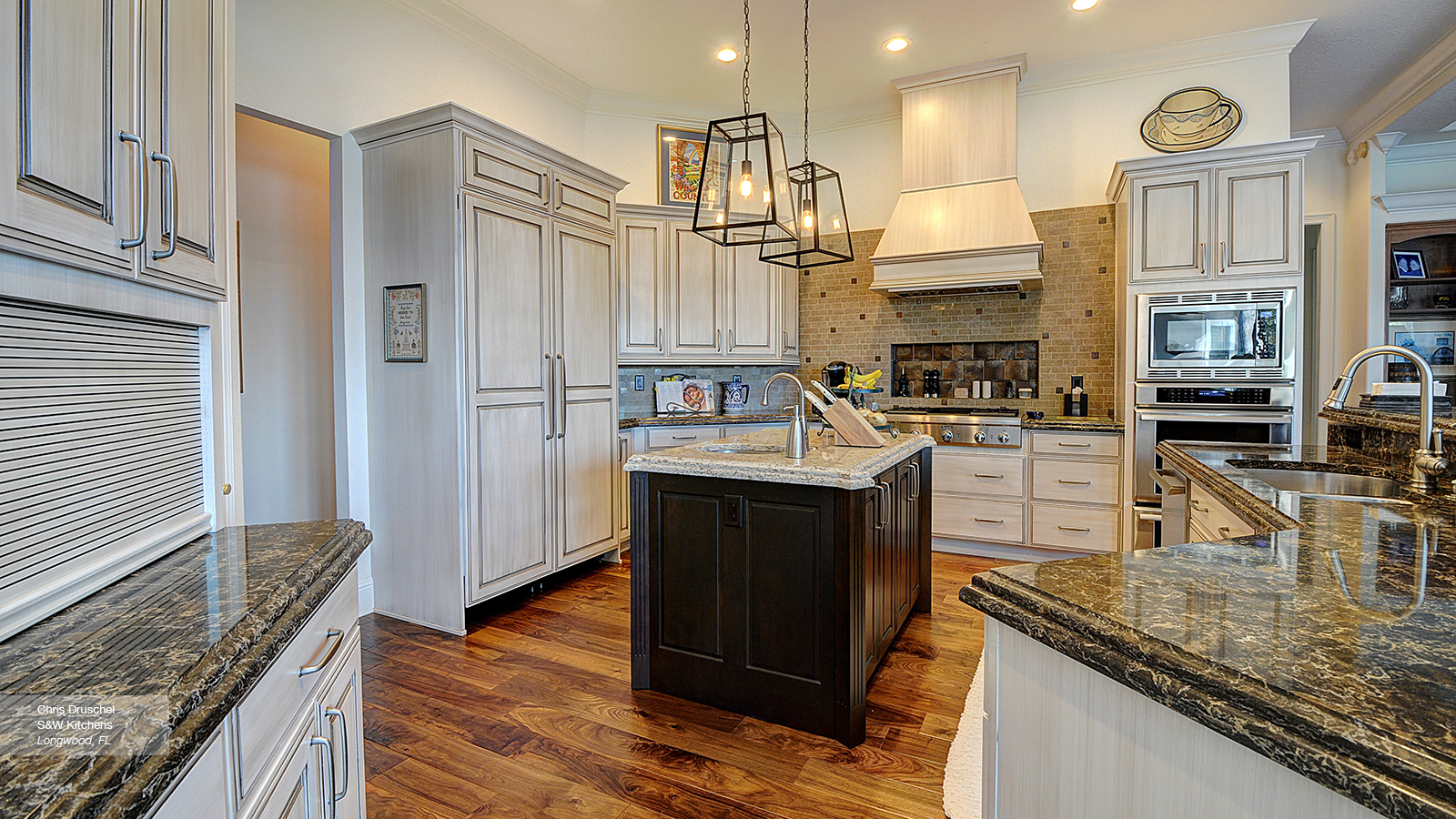 Adding impeccable accent moulding and a unique color contrast to a traditional kitchen suddenly gives it a burst of character to merge into a personality all its own. The airy effects from off white cabinets combine with the warm and soothing outcomes of a dark wood kitchen island to create a visually stimulating and fervently welcoming space.