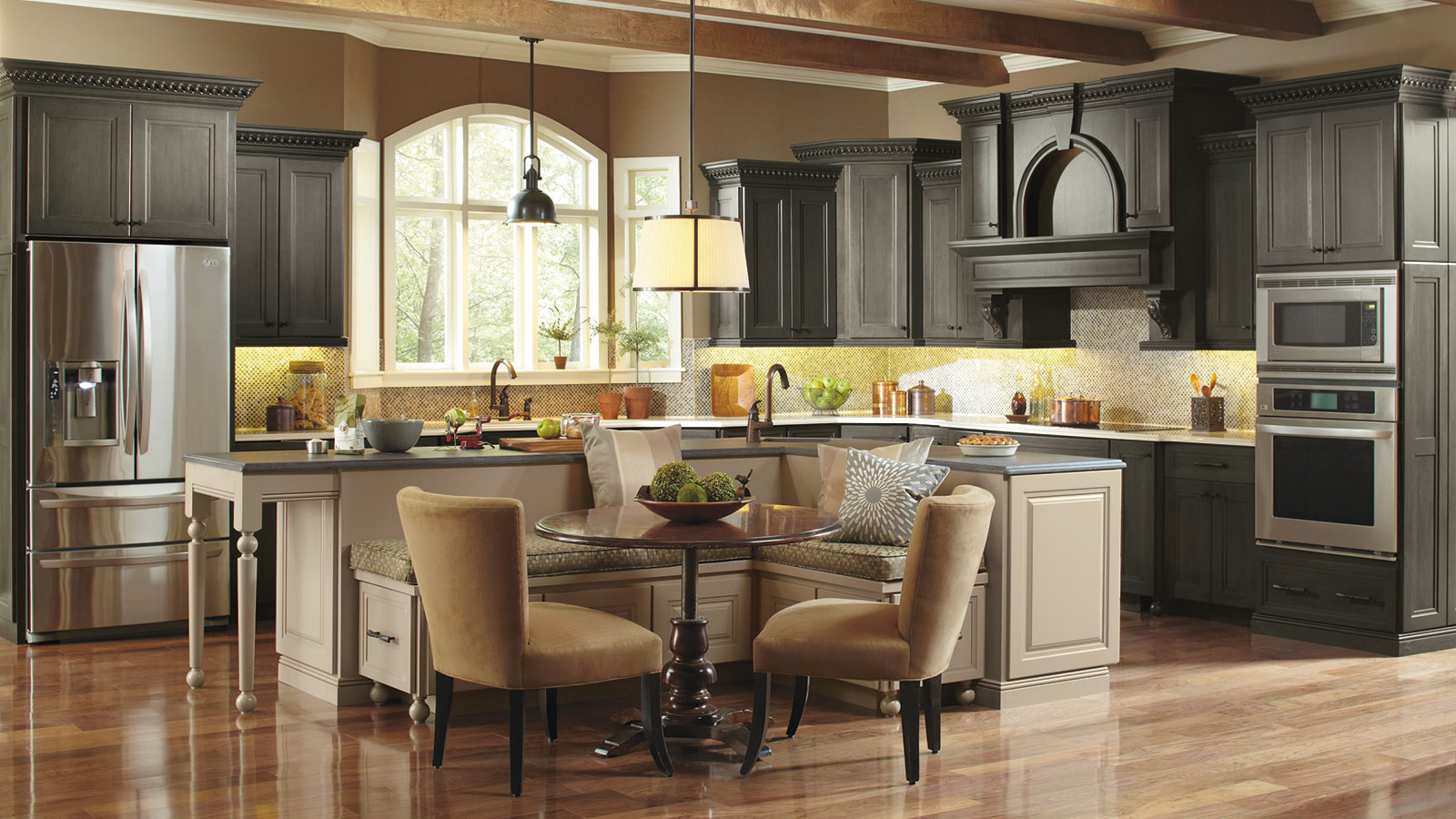 Enjoy a feast of creative ideas. Ornate mouldings draw the eye up, while architectural detail on the large kitchen island creates interest at the floor level. Combining styles with complementary flat and raised panels and contrasting finishes create a space that is beautifully unique.