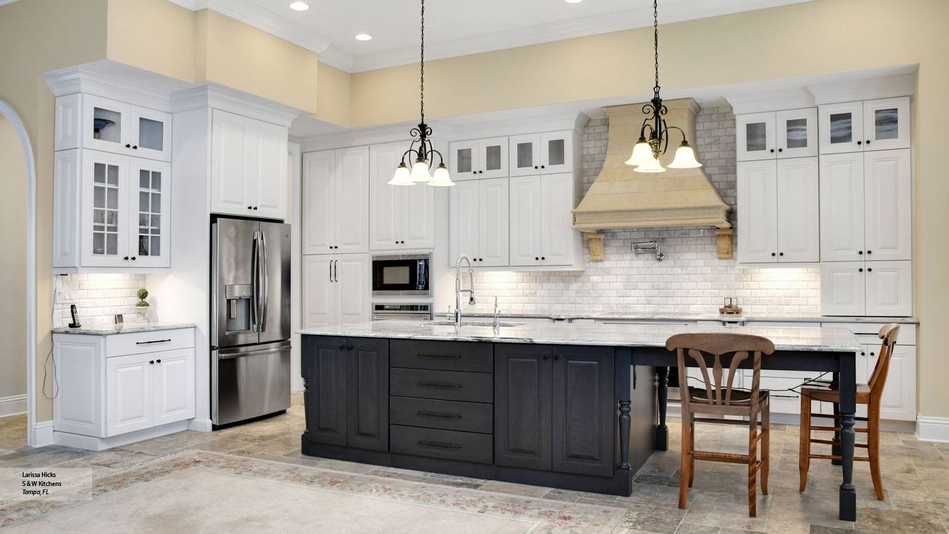 Bold beauty and elegance allow for your creativity to shine through in this masterpiece of a kitchen. Pairing the clean look of white cabinets in our Pearl finish with our deep Smokey Hills on the gray island, the result is a match made in finish heaven.