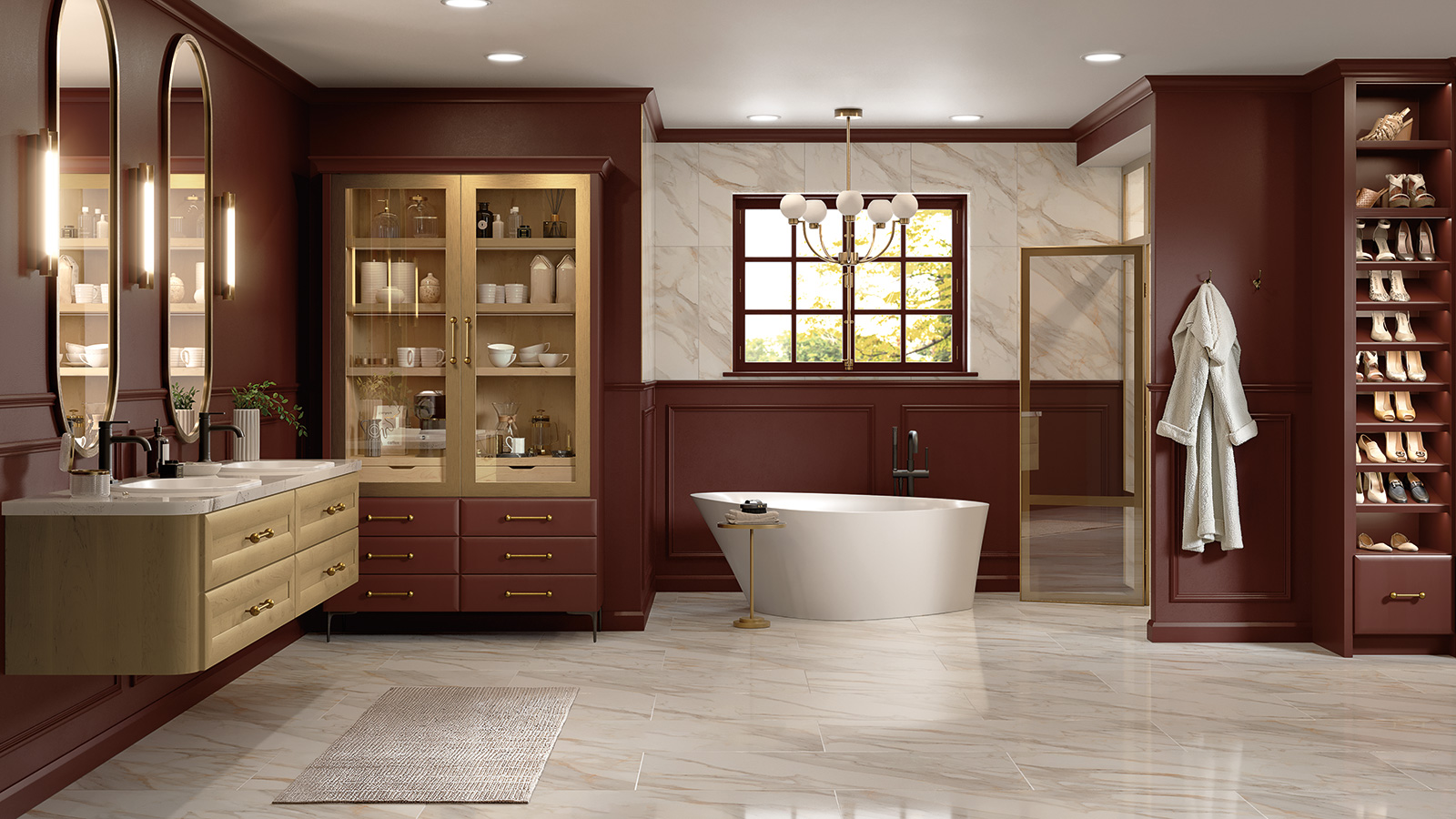 To elevate the look of this this primary en-suite, a wall-hung vanity was chosen. Rounded end columns were applied to soften the vanity sides and to complement the profile of the Pezzo drawer fronts for an organic yet sophisticated feel. Ask your designer how Omega's custom cabinetry can create a luxurious bath worthy of a 5-star hotel!