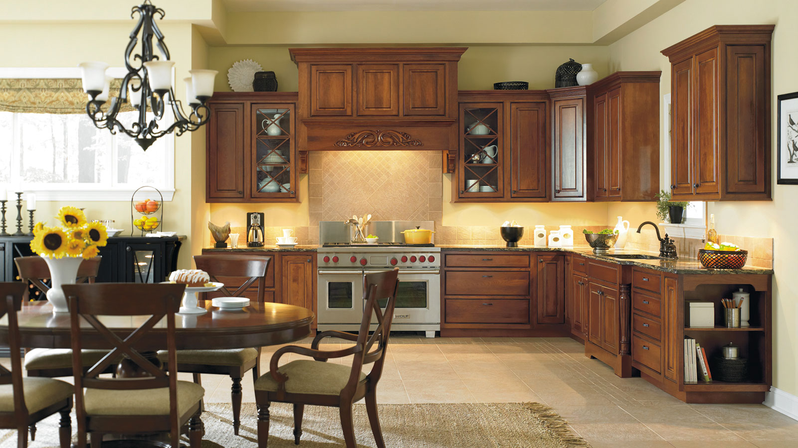 A relaxed yet refined space pays tribute to the role a gracious kitchen can have as the heart of the home. Beaded inset kitchen cabinets in Cherry Nutmeg with Onyx pair beautifully with rich glazes, which highlight door, moulding and embellishment details.