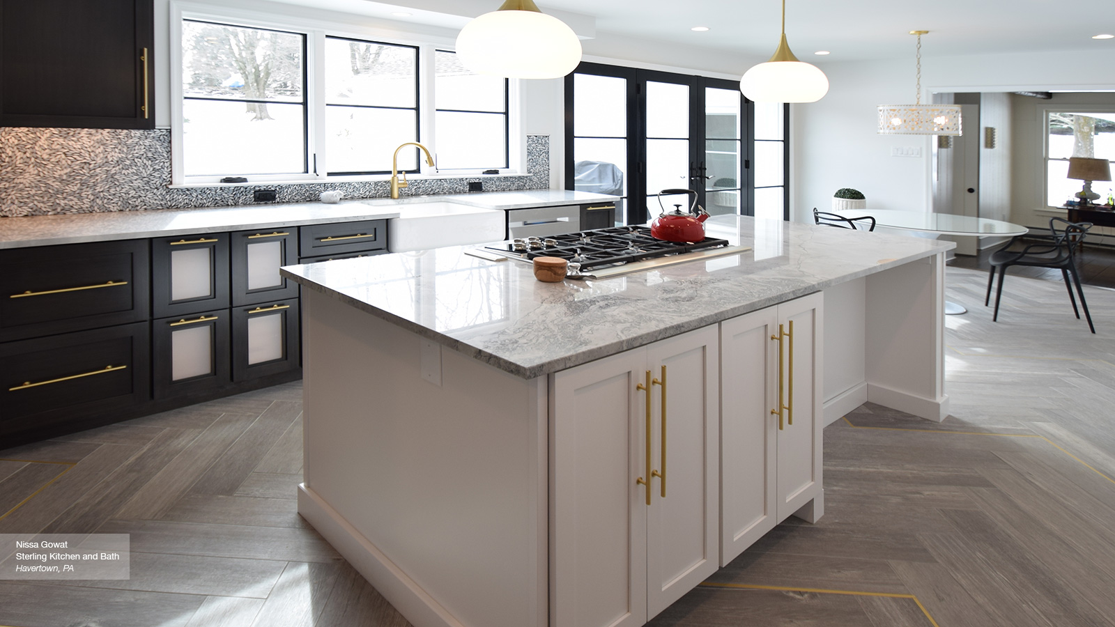 Make a statement using brass elements with contrasting black and white kitchen cabinets. Unique accents throughout the kitchen lend a distinct personality to the classic look of Shaker style cabinets.