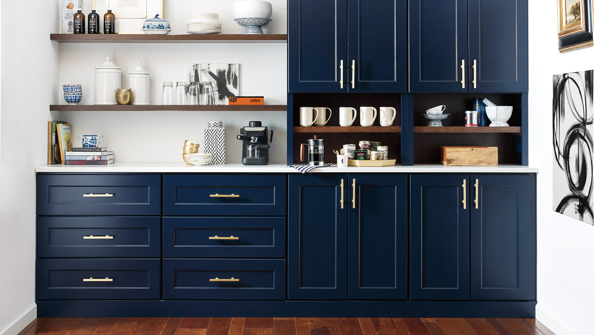 A butler's pantry with bold style - Renner is the perfect door style for a look that is timelessly on-trend. Custom blue cabinets through Omega elevate the entire look to a new level, while gold accents provide a welcome contrast.