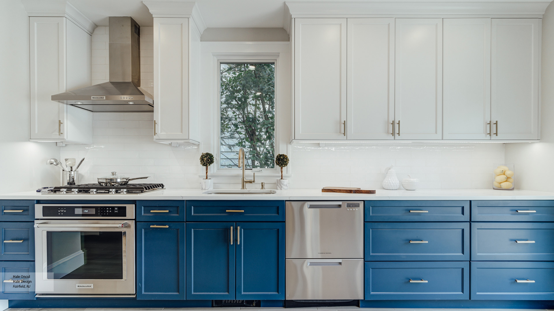 Casual Blue and White Painted Maple Kitchen Cabinets