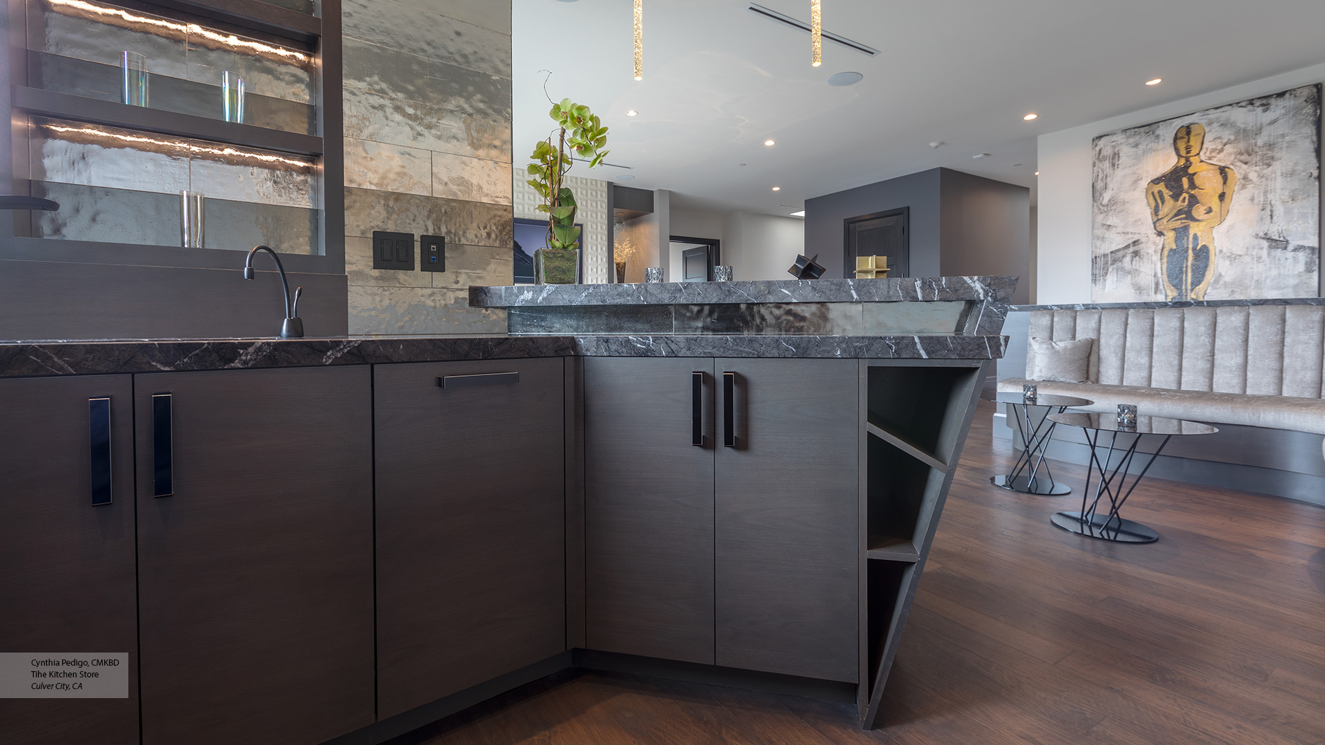 Interesting lines, bold accents, and a mix of textures make this den a modern marvel. The simplicity of the Tarin door styles allows the Smokey Hills finish on Walnut to steal the show.