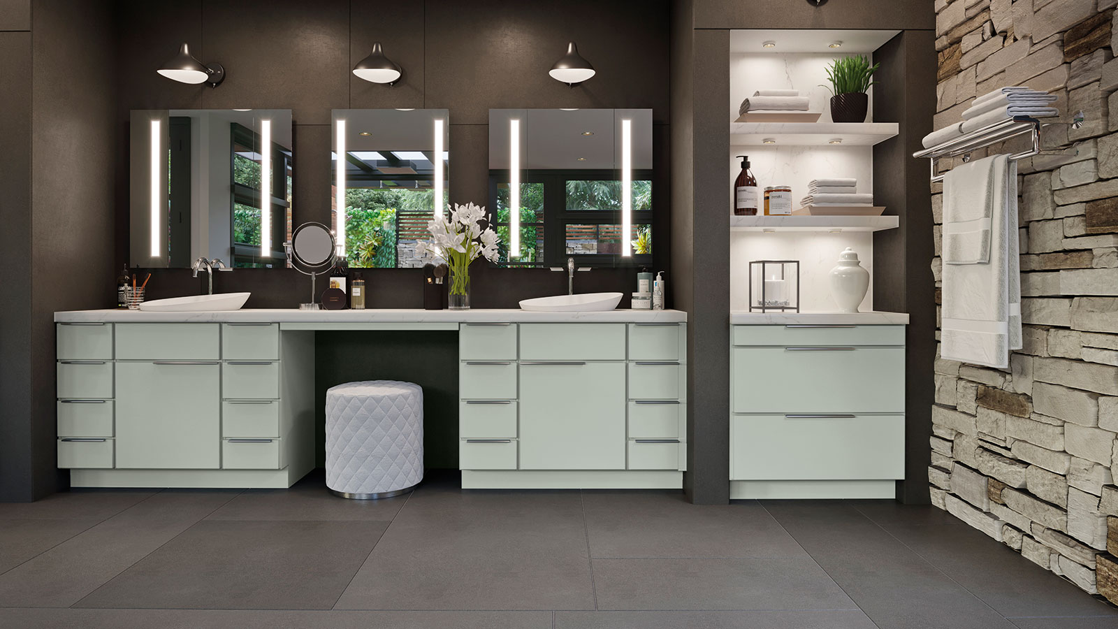 The simplicity of the Tarin door style in the Rain cabinet color honors the sweetness of a soft summer shower, while partnering perfectly with the texture of stacked stone. Adding depth of color in the surrounding finishes create a look that is strikingly unexpected.