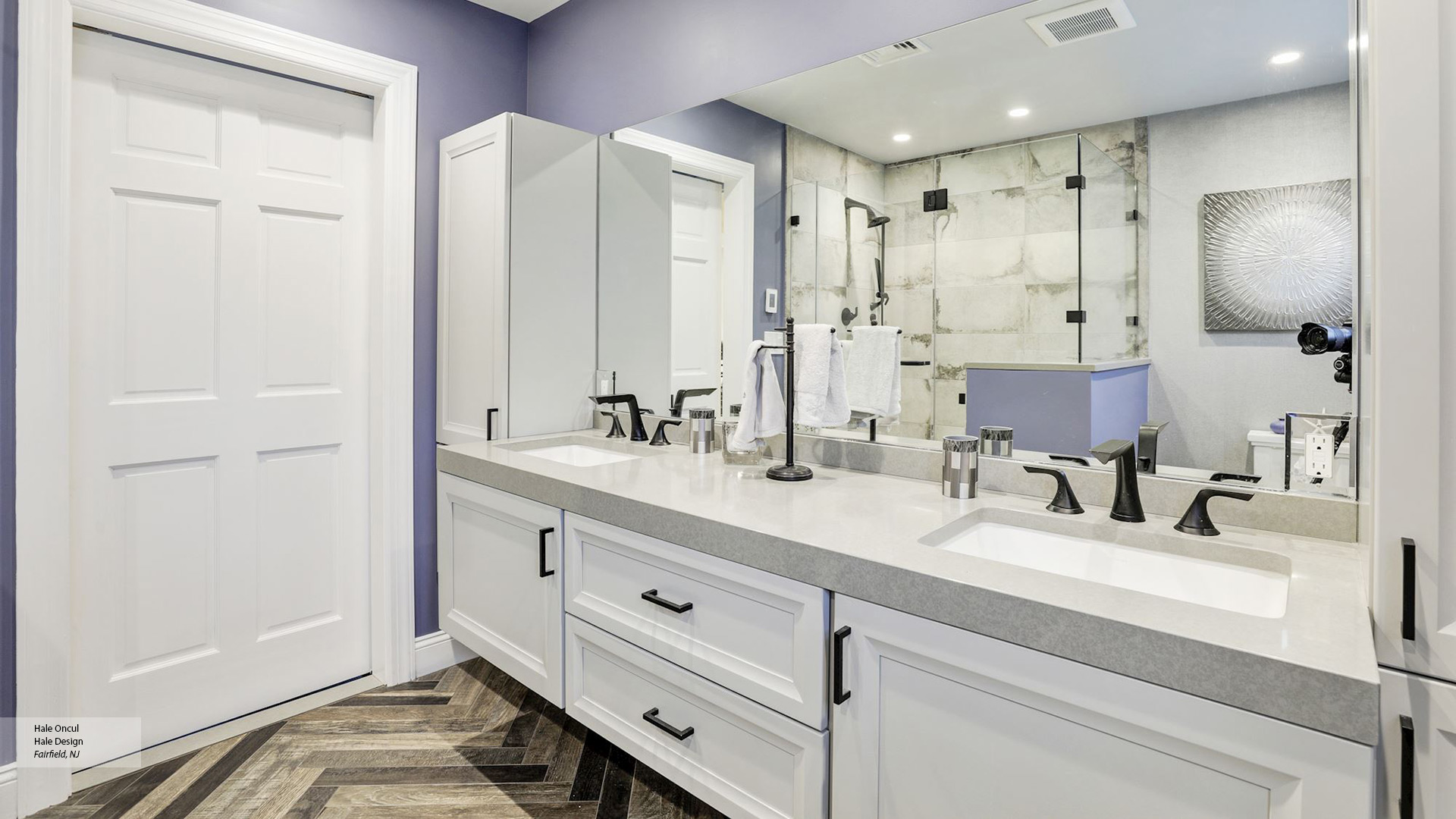 The Ultima door style is the perfect canvas to showcase the Pearl finish on Maple in this simple, yet full-of-style bathroom. Offering ample storage, a beautiful color scheme, and double sinks to save time, what's not to love?
