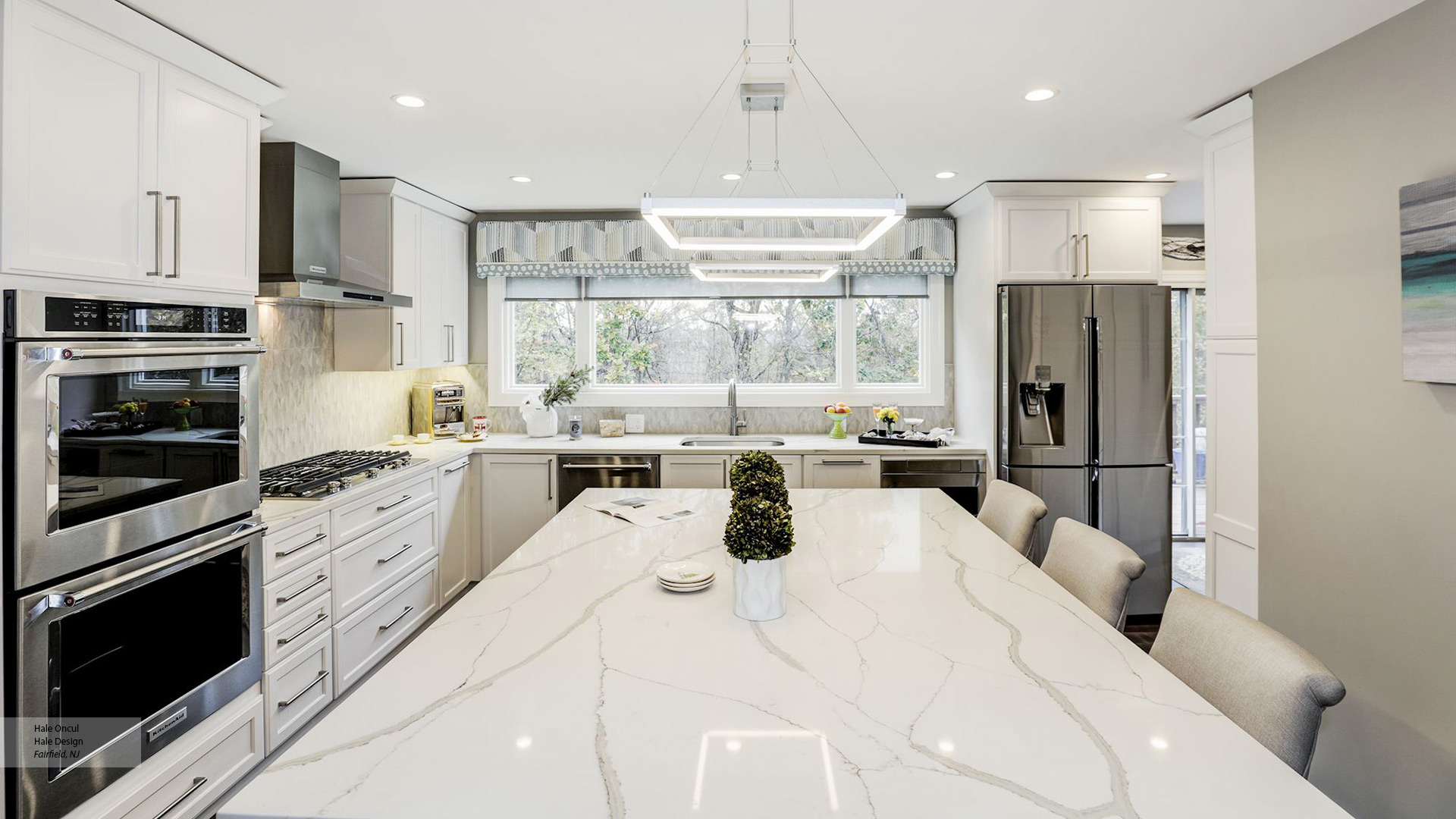 The gorgeous Ultima Walnut island in the Smokey Hills finish not only acts as this kitchen's focal point, but also as an area for kitchen storage, and of course, a gathering spot for your tribe. The Pearl finish, also on the Ultima door style, is the perfect contrast to complete the room's stunning look.